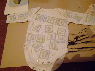 Next, I obtained some babygrows and inked up the blocks with paint and a roller and started printing.
